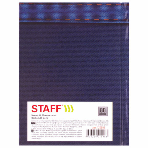 Блокнот МАЛЫЙ ФОРМАТ (110х147 мм) А6, 80 л., твердый переплет, ламинированная обложка, клетка, STAFF, "Джинса", 120952