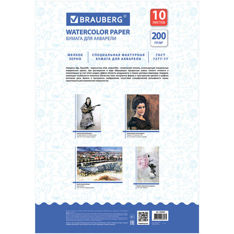 Бумага для акварели А4, 10 л., 200 г/м2, BRAUBERG,