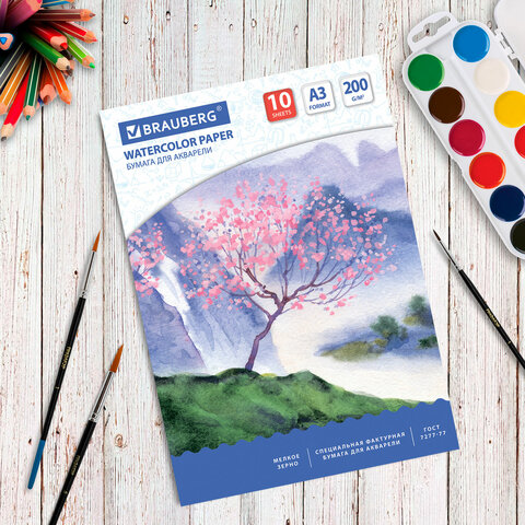 Бумага для акварели БОЛЬШАЯ А3, 10 л., 200 г/м2, BRAUBERG, "Сакура", 125224