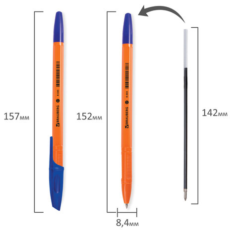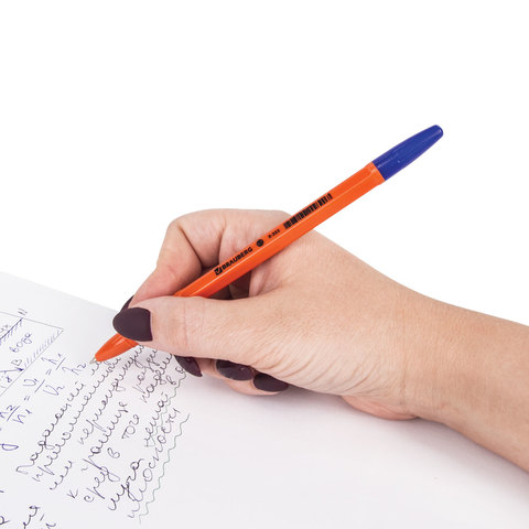 Яркая шариковая ручка с оранжевым корпусом, вентилируемым колпачком и удобной трёхгранной зоной захвата с рифлением, препятствующим скольжению пальцев при письме. Ручка снабжена сменным стержнем 142 мм, что позволяет увеличить срок службы. Диаметр пишущего узла 0,7 мм создает тонкую линию письма, равную 0,35 мм. Цвет чернил - синий.