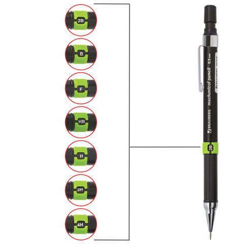 Механический карандаш BRAUBERG с корпусом черного цвета и хромированными деталями. Оснащен передвижным колечком, позволяющим обозначить твердость грифеля внутри.