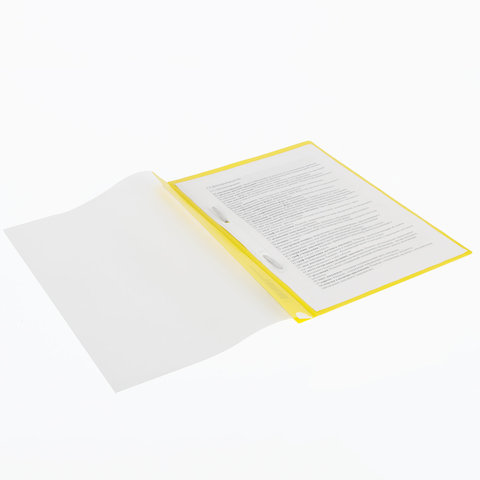 Фиксирует до 100 листов формата А4. Толщина пластика верхнего листа составляет 140 мкм, а нижнего - 180 мкм. Предельно простой механизм подшивки: металлические усики и пластиковая планка для надежной фиксации документов. Мультиперфорация по краю обложки позволяет подшивать изделие в папки с любым механизмом. Скоросшиватель изготовлен из качественного полипропилена. Прозрачный верхний лист позволяет определить содержимое, не открывая скоросшиватель, который к тому же снабжен сменным пластиковым корешком, что дает возможность структурировать информацию. Благодаря фактуре "песок" и яркому желтому цвету обложки папка никогда не затеряется на полке.
