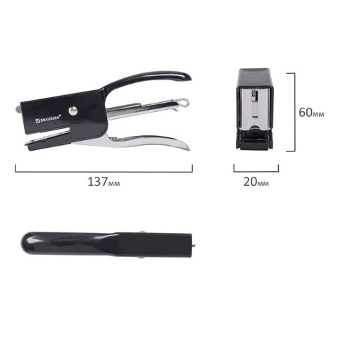 Энергосберегающий степлер-плаер BRAUBERG "Special" в черном пластиковом корпусе с металлическим механизмом и дополнительным отсеком для скоб cпособен БЕЗ УСИЛИЙ скрепить до 25 листов. Подходящий размер скоб № 24/6, 26/6. Вид сшивания: закрытый. Глубина закладки бумаги - 34 мм. Габариты: высота - 60 мм, ширина - 20 мм, длина - 137 мм. Благодаря компактным размерам удобен в использовании и занимает мало места на рабочем столе, а классический дизайн делает степлер подходящим к любому интерьеру. Продается в картонной упаковке.