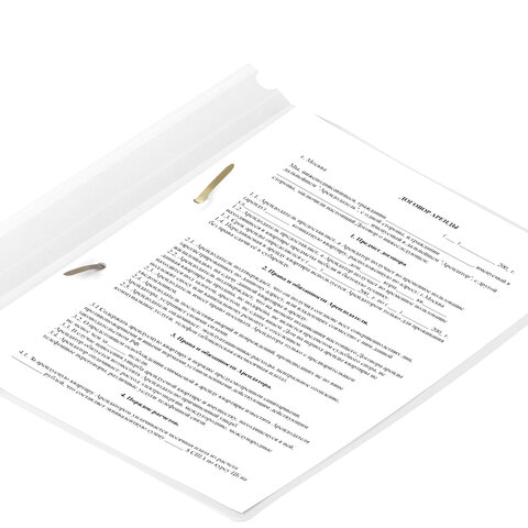 Фиксирует до 100 листов формата А4. Толщина пластика для верхнего листа - 130 мкм, для нижнего - 180 мкм. Предельно простой механизм подшивки: металлические усики и пластиковая планка для надежной фиксации документов. Скоросшиватель изготовлен из полипропилена. Снабжен прозрачным верхним листом. Для идентификации имеет сменный пластиковый корешок. Благодаря фактуре "песок" и белоснежному цвету обложки важная папка никогда не затеряется на полке.