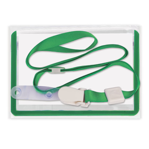 Комплектуется специальной нейлоновой лентой со съемной клипсой. Бейдж можно носить на ленте, либо крепить на одежду с помощью клипсы. Размер вкладыша 55х90 мм. Длина ленты 45 см, цвет ленты - зеленый. Упакован в пластиковый пакет.