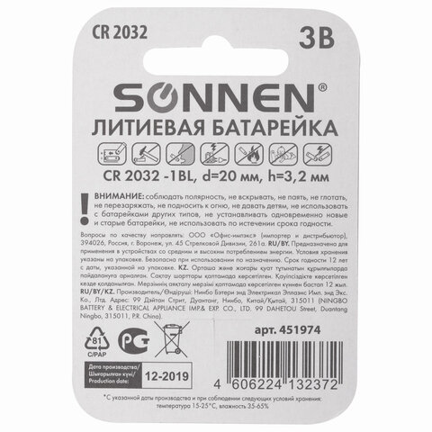 Типоразмер CR 2032 (дисковые) - один из самых востребованных и мощных в своем типоразмере вид батареек. Литиевые батарейки адаптируются к перепадам температуры, высоким нагрузкам и разряжаются равномерно, нет резкого падения мощности при потере заряда. Батарейка SONNEN CR 2032 обеспечит длительный срок эксплуатации вашего устройства благодаря постоянному напряжению - 3 В. Бренд SONNEN - это качество, надежность и уверенность в своей продукции.