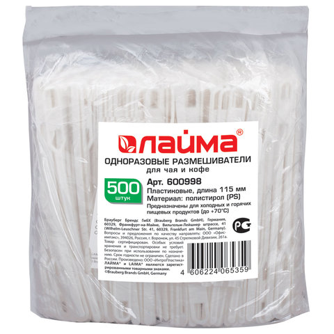 Одноразовые размешиватели для чая и кофе 115 мм, КОМПЛЕКТ 500 шт., "БЮДЖЕТ", пластиковые, ПС, LAIMA, 600998